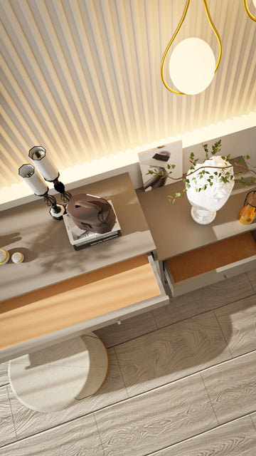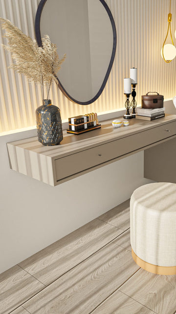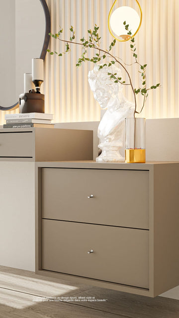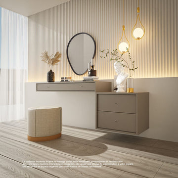 Élevez votre espace de beauté avec notre coiffeuse murale : élégante, pratique et moderne. La coiffeuse centrale suspendue est parfaite pour vos bijoux et cosmétiques, tandis que le rangement latéral offre un espace supplémentaire pour tous vos autres articles essentiels. Libère de l'espace au sol et est idéal pour les jeunes femmes soucieuses du style et de la fonctionnalité.